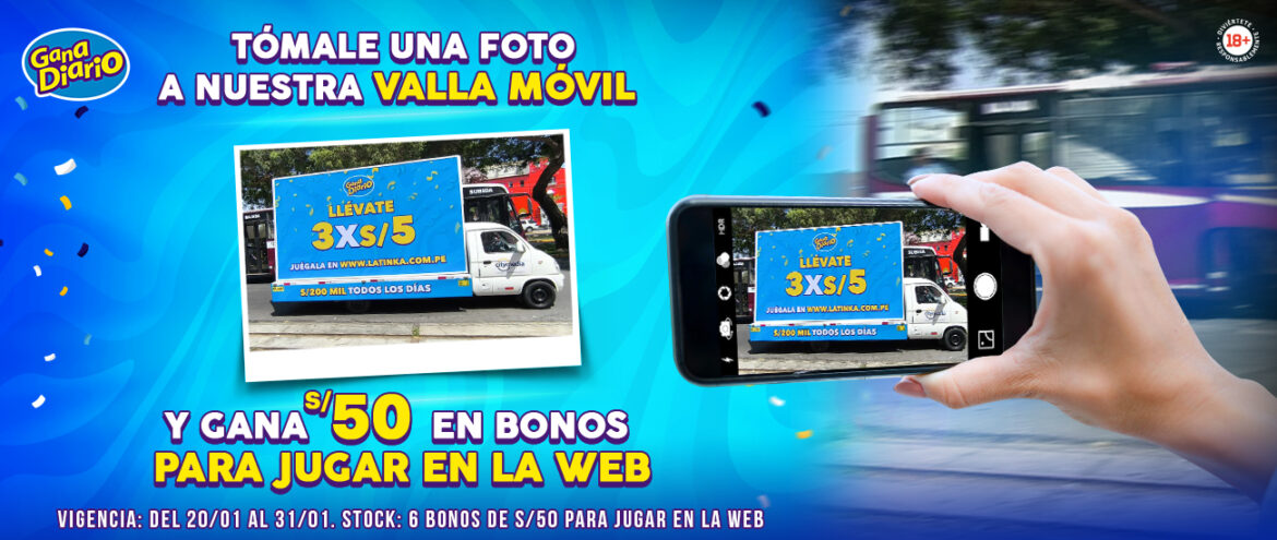 Válido para participar del lunes 20 de enero del 2025 al viernes 31 de enero del 2025. Los resultados serán los días viernes 17 y viernes 31 de enero, escogeremos 3 ganadores semanales y se les dará un premio de S/50 en bonos de loterías para jugar en nuestra página web www.latinka.com.pe, el monto será repartido en las siguientes jugadas: 5 jugadas gratis de Kábala, 5 jugadas gratis de Gana Diario, 2 jugadas gratis de Tinka y S/20 en Casino.