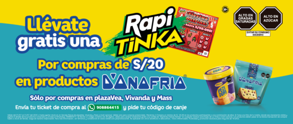 Promoción vigente desde el 01 de julio del 2025 hasta el 31 de julio del 2025 y/o hasta agotar stock. Válido solo para compras realizadas en tiendas físicas de Plaza Vea, Vivanda y Mass a nivel nacional. Mecánica: i) Compra un mínimo de S/. 20.00 en los productos participantes o una combinación de ellos: ii) Toma una foto de tu boleta, donde sea claramente visible y legible el detalle de los productos comprados y envíala al Whatsapp: 908864415. iii) Recibe un código numérico de 26 dígitos, válido para canjear totalmente gratis una cartilla de “Rapitinka Fiestas Patrias” en cualquier módulo autorizado de La Tinka a nivel nacional. En caso no haya Stock de Rapitinka “Fiestas Patrias” se entregará la Rapitinka “Peruanazo”. Sujeto a stock de tienda. Promoción exclusiva para mayores de 18 años. Juega de manera responsable. Para más información, ver términos y condiciones en www.nestle.com.pe/promociones.