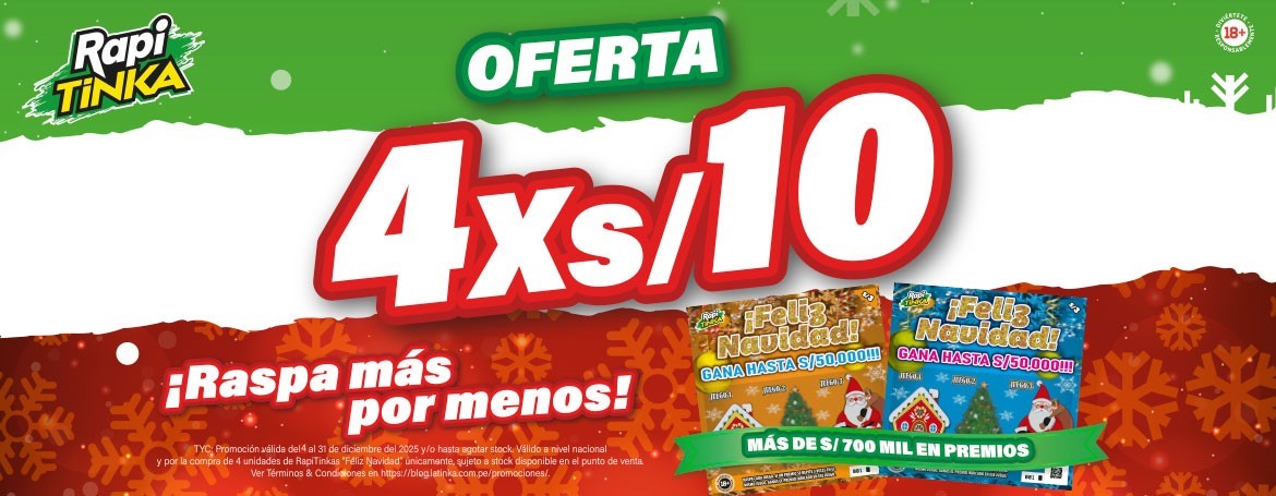 Por la compra del combo de cuatro unidades de la Rapitinka “Feliz Navidad”, el usuario podrá acceder al precio promocional de S/ 10.00, el cual se verá reflejado en el pago final de la compra del combo, sujeta a la disponibilidad de stock en el punto de venta.
