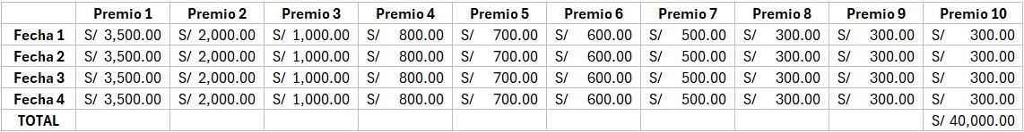 La distribución específica de los premios, incluyendo número de ganadores y montos por cada fecha de sorteo, se detalla en la siguiente tabla de premios: