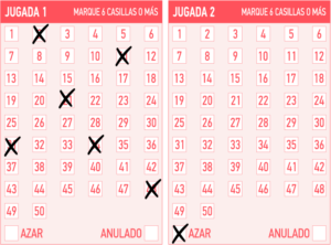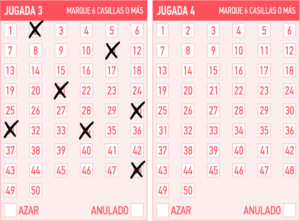 - Jugada Simple: Debes marcar 6 números en la cartilla de un total de 50.